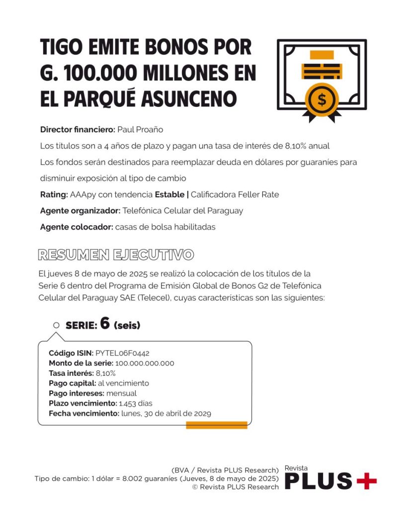 El jueves 8 de mayo de 2025 se realizó la colocación de los títulos de la Serie 6 dentro del Programa de Emisión Global de Bonos G2 de Telefónica Celular del Paraguay SAE (Telecel), cuyas características son las siguientes: