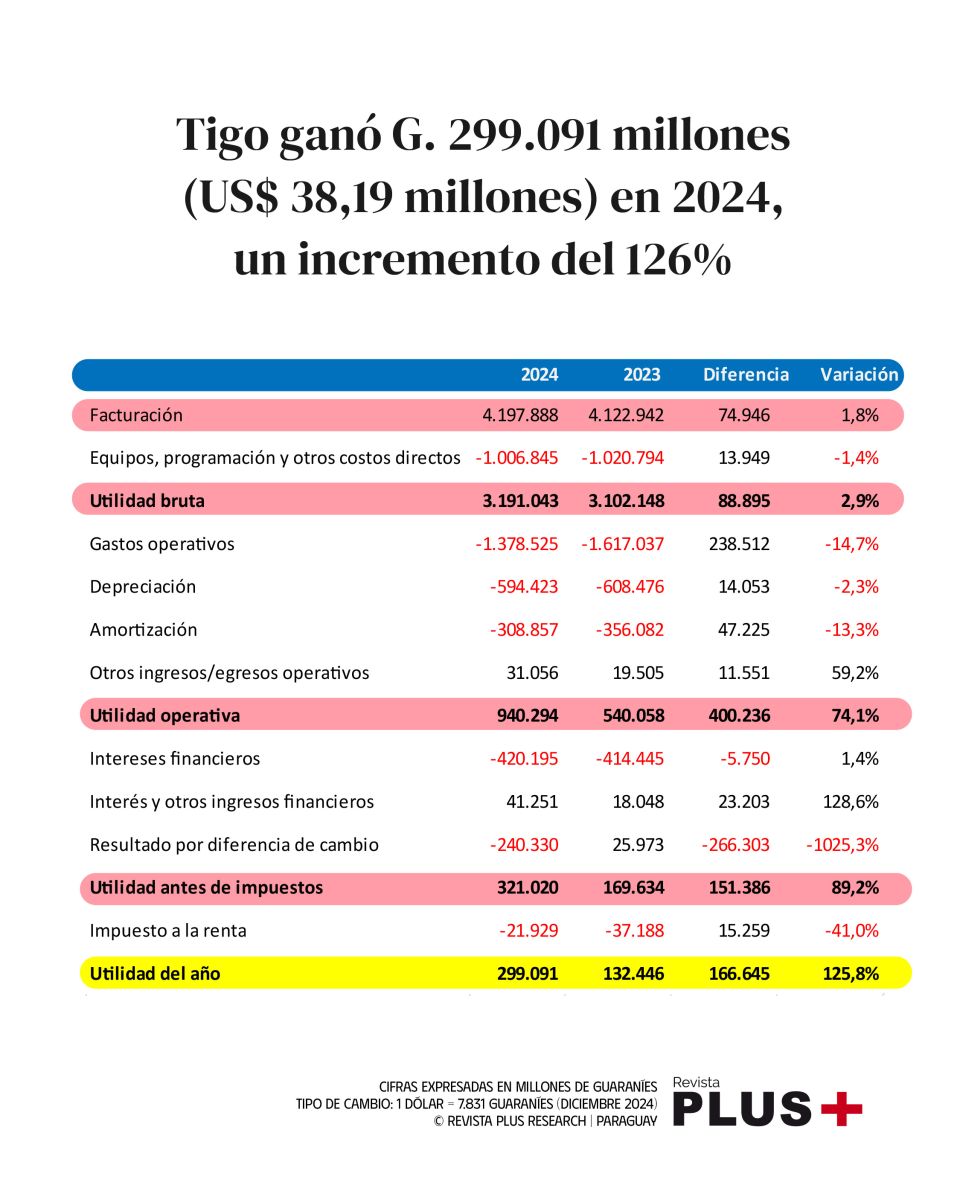 En el ejercicio fiscal 2024, Tigo reportó ganancias por G. 299.091 millones (US$ 38,19 millones) un incremento del 126% con relación al año precedente.