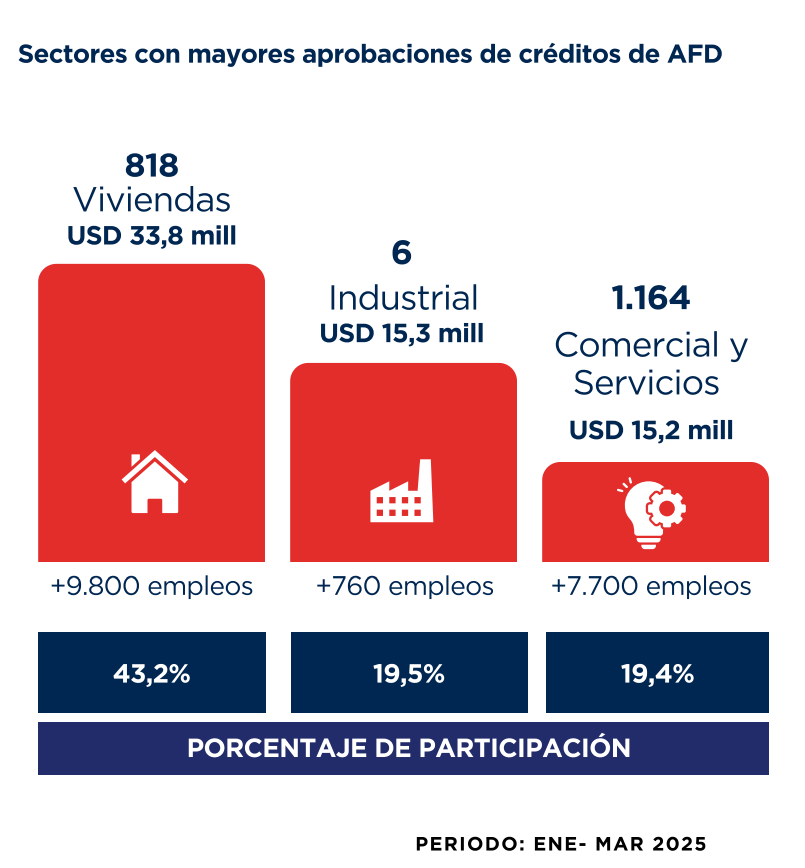 De enero a marzo del 2025, la Agencia Financiera de Desarrollo (AFD), logró aprobar créditos por US$ 78 millones desde enero a marzo del 2025. beneficiando a unas 2.065 personas y empresas, generando 24.710 empleos directos y/o mantenidos.