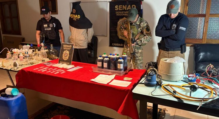 Por primera vez en el país fue detectado un laboratorio clandestino artesanal destinado a la producción de metanfetamina, una droga sintética de alto poder adictivo y grave impacto en la salud pública, en una vivienda ubicada en el Km 24, lado Acaray, en la ciudad de Minga Guazú, informa la Secretaría Nacional Antidrogas (Senad).