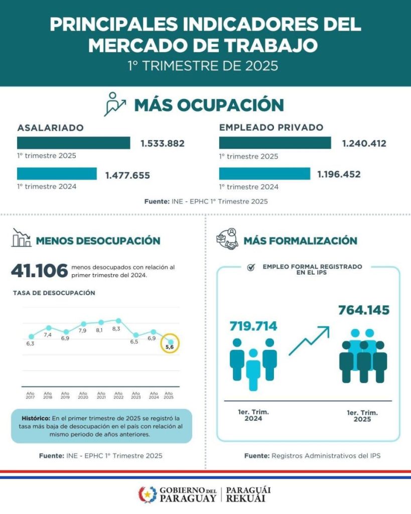 La población ocupada en el país creció de 2.869.687 en el primer trimestre de 2024 a 2.911.705 en el mismo periodo de 2025. La tasa de desocupación fue la más baja para un primer trimestre desde 2017. Además, aumentó el empleo formal, con más trabajadores registrados en el IPS que en el mismo periodo del año anterior.