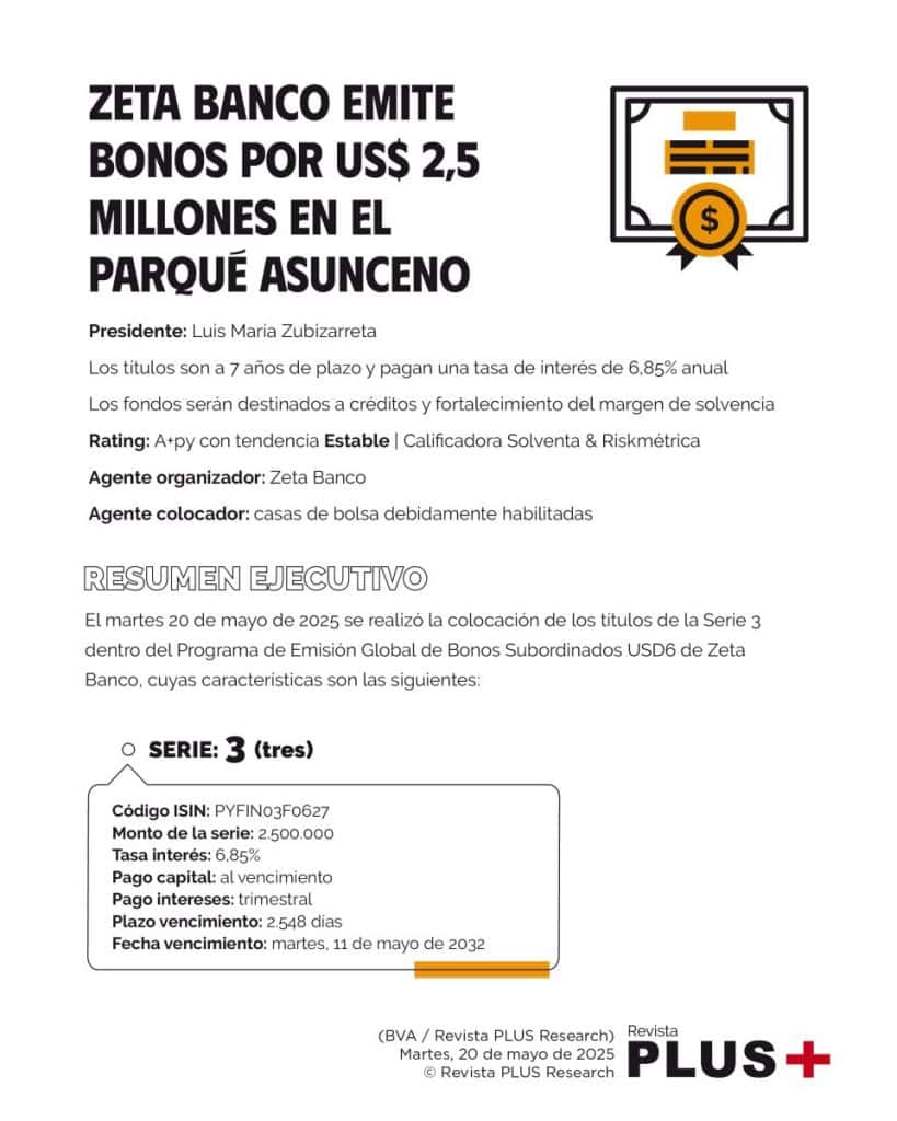 El martes 20 de mayo de 2025 se realizó la colocación de los títulos de la Serie 3 dentro del Programa de Emisión Global de Bonos Subordinados USD6 de Zeta Banco, cuyas características son las siguientes: