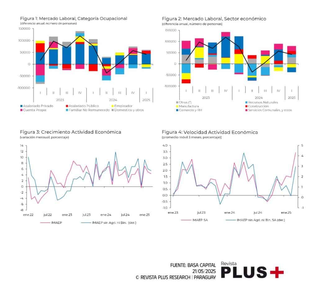 A principios de 2025, el mercado laboral paraguayo tuvo un desempeño moderado, en contraste con la solidez de la actividad económica. Según la Encuesta Permanente de Hogares del INE, en el primer trimestre se generaron 41.838 empleos netos, de los cuales 43.959 fueron puestos asalariados. Al mismo tiempo, se destruyeron 12.707 empleos de empleadores, lo que es preocupante, ya que las pequeñas y medianas empresas (pymes), que concentran la mayor parte del empleo formal en Paraguay, redujeron su presencia en el mercado.