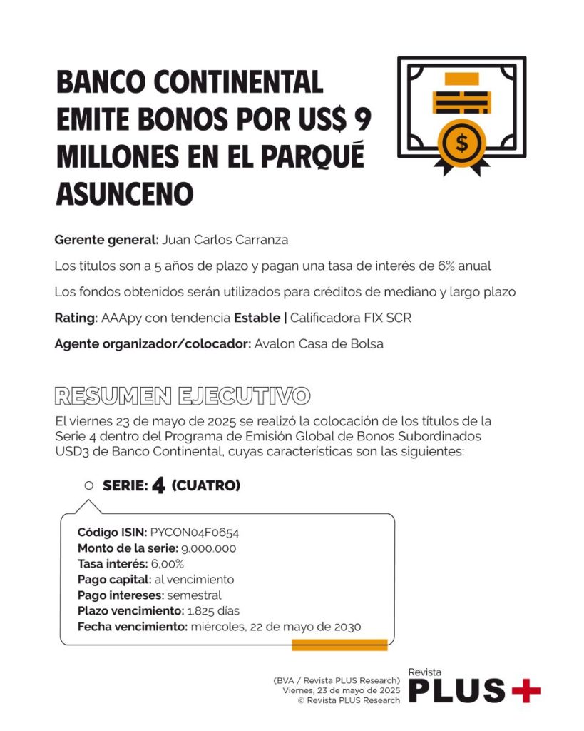 El viernes 23 de mayo de 2025 se realizó la colocación de los títulos de la Serie 4 dentro del Programa de Emisión Global de Bonos Subordinados USD3 de Banco Continental, cuyas características son las siguientes: