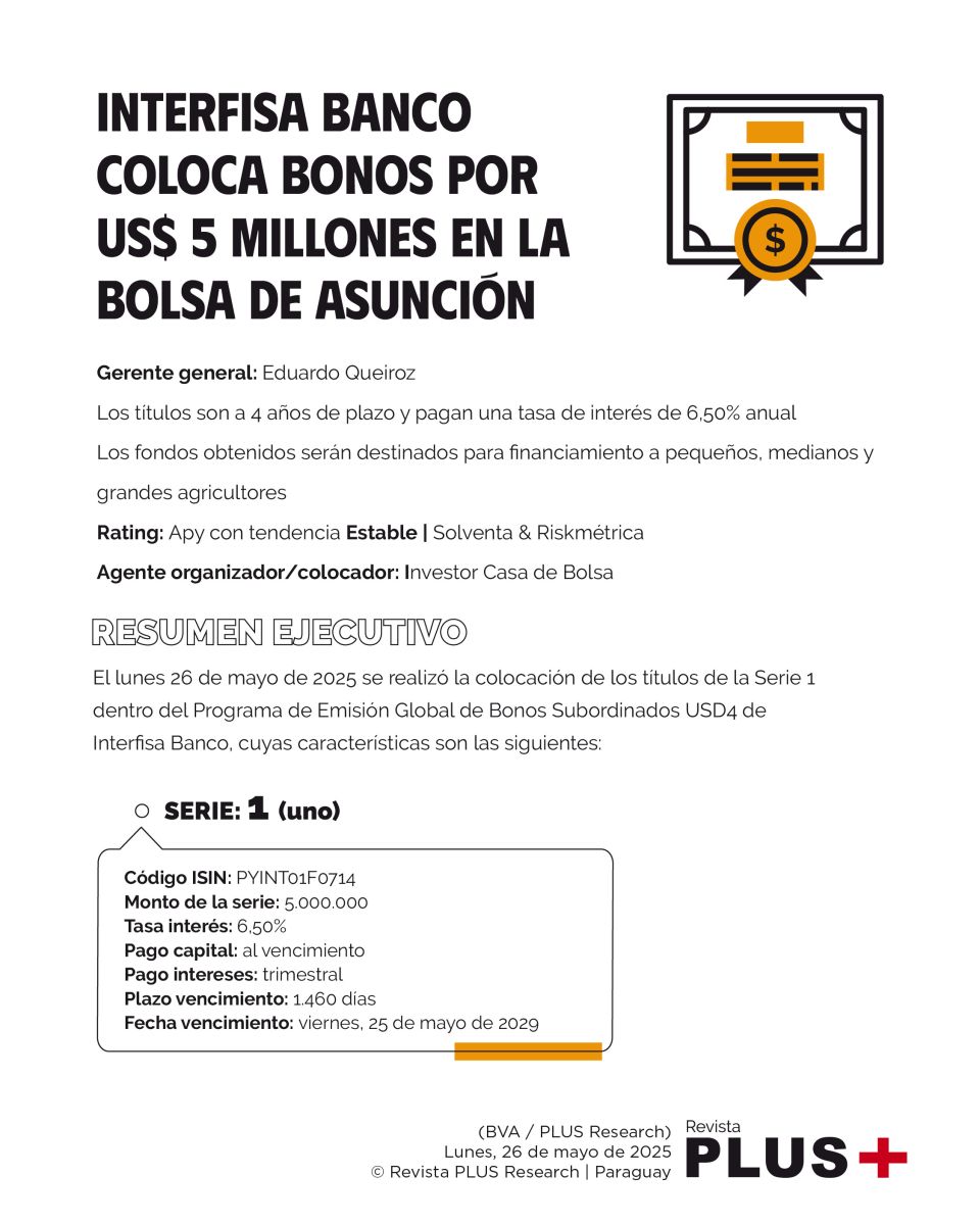 El lunes 26 de mayo de 2025 se realizó la colocación de los títulos de la Serie 1 dentro del Programa de Emisión Global de Bonos Subordinados USD4 de Interfisa Banco, cuyas características son las siguientes: