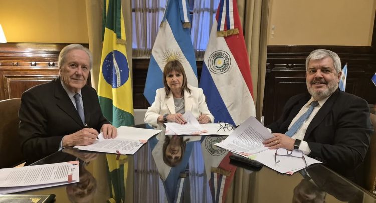 La ministra de Seguridad Nacional de Argentina, Patricia Bullrich, junto al ministro de Justicia y Seguridad Pública de Brasil, Enrique Lewandowski, y al ministro del Interior de Paraguay, Enrique Riera Escudero, firmaron el acuerdo que busca fortalecer el intercambio de información, coordinar operativos conjuntos y mejorar la respuesta regional ante delitos como el narcotráfico, el contrabando, la trata de personas, el tráfico de armas y el lavado de dinero.
