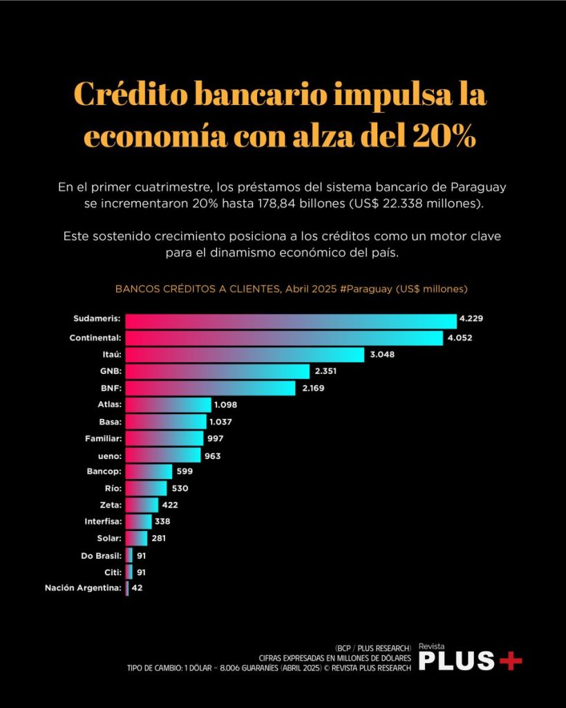 Asunción (Paraguay).- El sistema bancario paraguayo ha experimentado una dinámica interesante en el primer cuatrimestre de 2025, con un incremento del 20% en los préstamos, alcanzando los 178,84 billones de guaraníes (equivalente a US$ 22.338 millones).