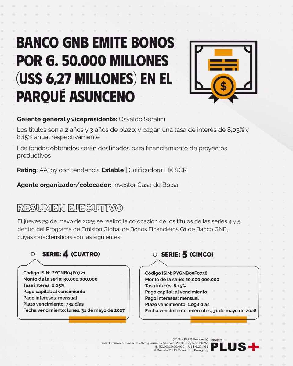 El jueves 29 de mayo de 2025 se realizó la colocación de los títulos de las series 4 y 5 dentro del Programa de Emisión Global de Bonos Financieros G1 de Banco GNB, cuyas características son las siguientes:
