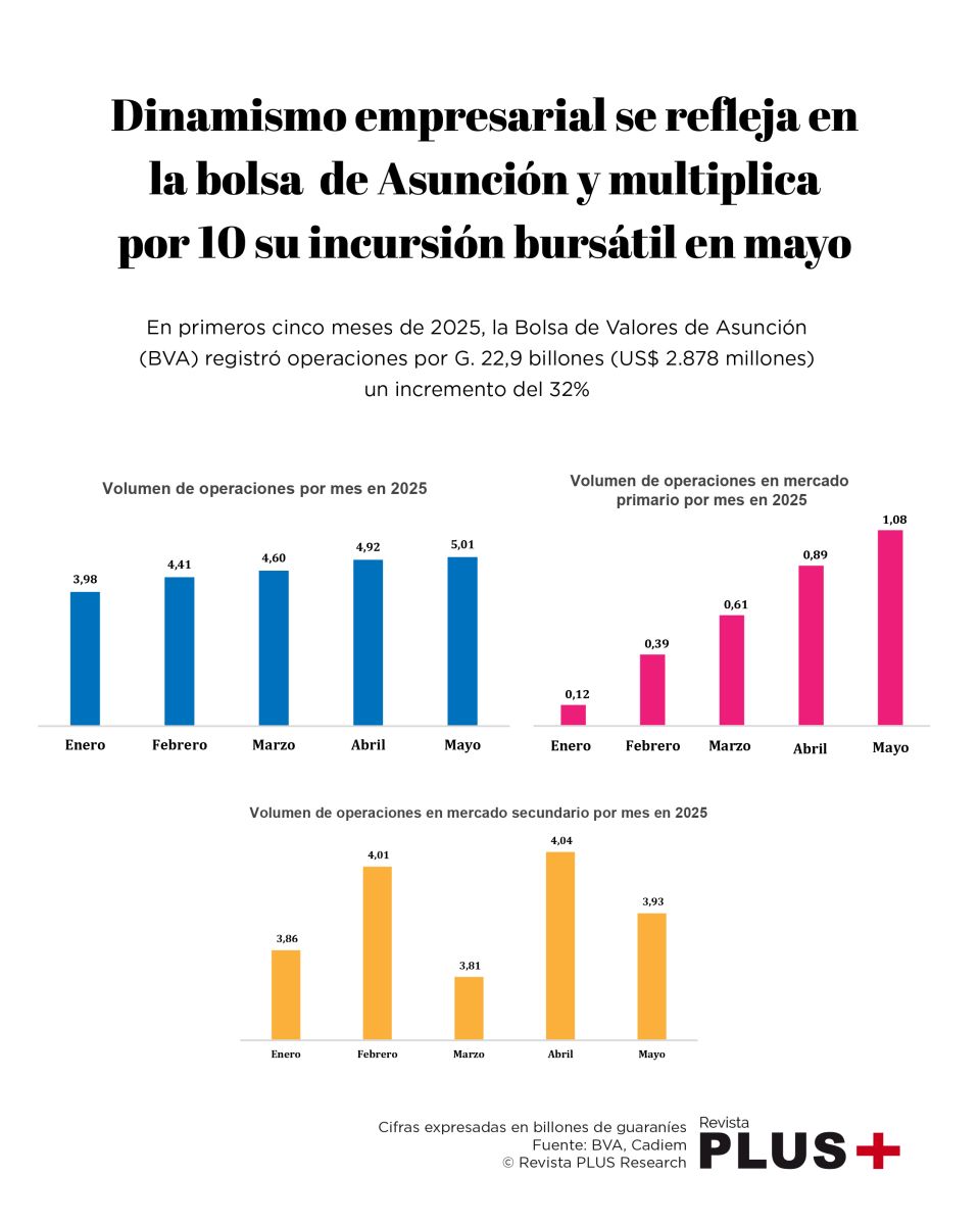 El mercado secundario, por su parte, sigue siendo el más voluminoso, con una participación del 85% en el acumulado del año y un volumen de G. 19,6 billones (US$ 2.469 millones) hasta mayo, registrando un crecimiento de 22,5%.