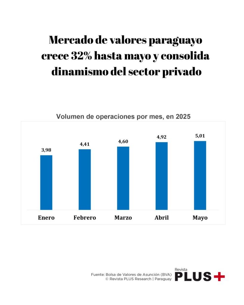 El mercado bursátil paraguayo continúa consolidando su expansión. Al cierre de mayo del 2025, la Bolsa de Valores de Asunción (BVA) registró operaciones por G. 22,9 billones (aproximadamente US$ 2.878 millones), lo que representa un crecimiento acumulado del 32% en comparación con el mismo período del año anterior.