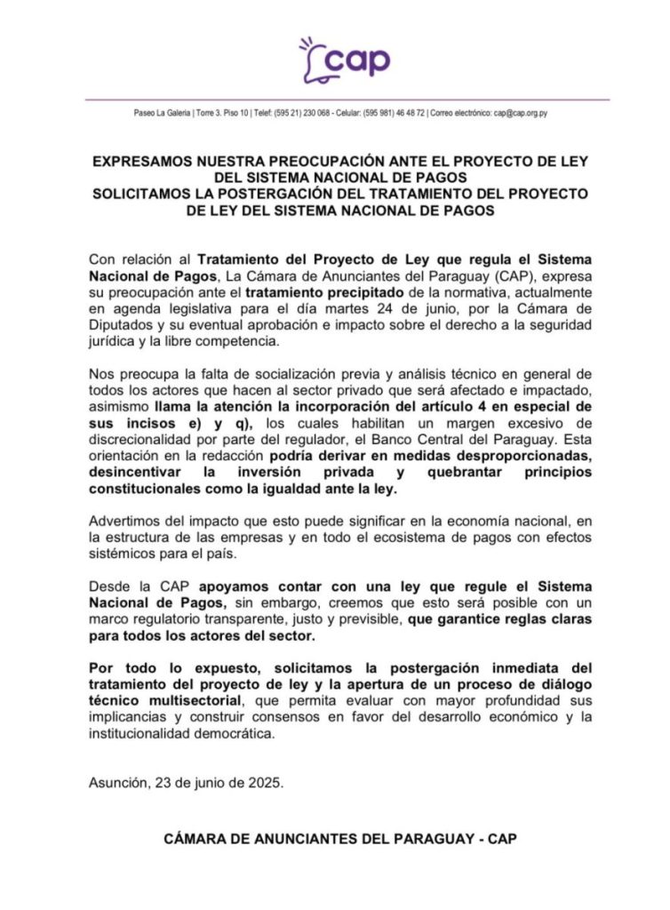 La Cámara de Anunciantes del Paraguay (CAP) expresó públicamente su preocupación ante el inminente tratamiento legislativo del Proyecto de Ley que regula el Sistema Nacional de Pagos, cuya discusión está agendada para el martes 24 de junio en la Cámara de Diputados.