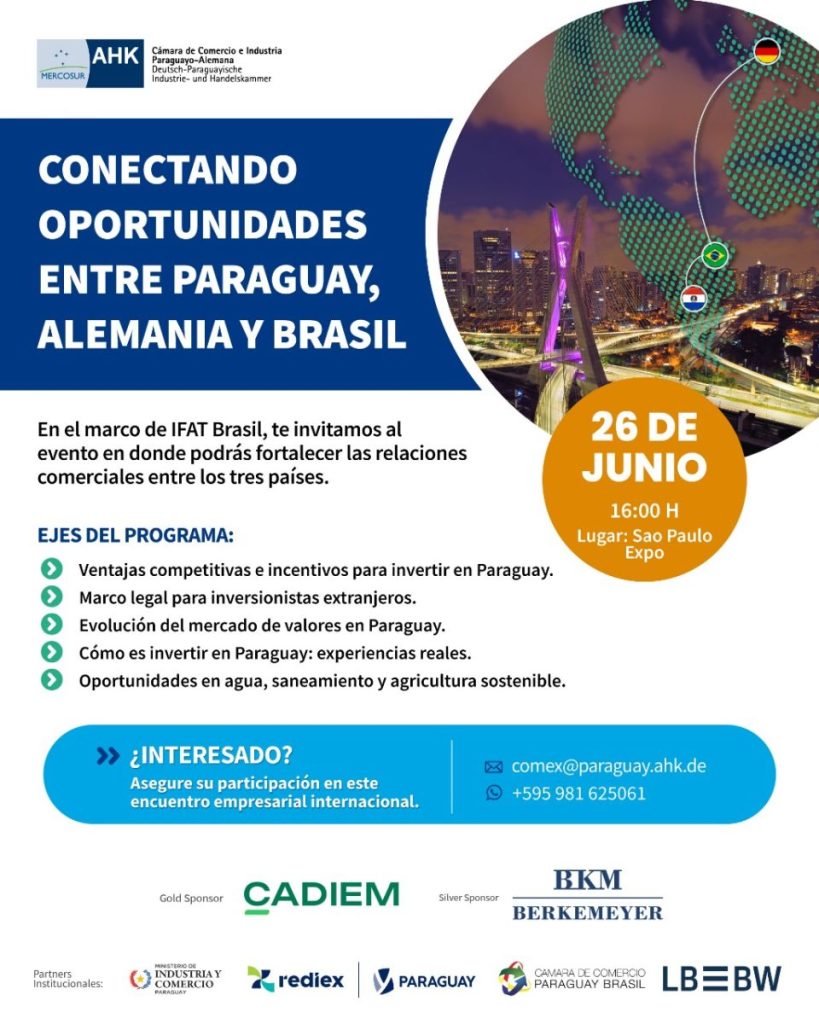 São Paulo (Brasil) – Paraguay tendrá una destacada participación en la feria internacional IFAT Brasil 2025, uno de los eventos líderes en tecnologías ambientales de América Latina. En ese marco, el próximo 26 de junio se llevará a cabo el encuentro “Conectando Oportunidades entre Paraguay, Alemania y Brasil”, organizado por la AHK Paraguay, con el apoyo estratégico de Rediex, la Cámara de Comercio Paraguay-Brasil y el banco LBBW.