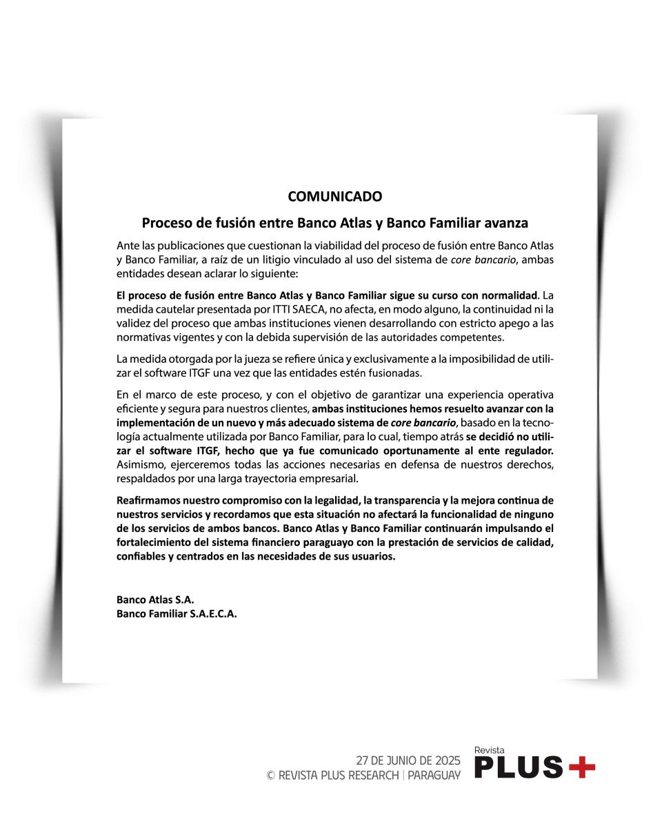El proceso de fusión entre Banco Atlas y Banco Familiar sigue su curso con normalidad. La medida cautelar presentada por ITTI SAECA, no afecta, en modo alguno, la continuidad ni la validez del proceso que ambas instituciones vienen desarrollando con estricto apego a las normativas vigentes y con la debida supervisión de las autoridades competentes.