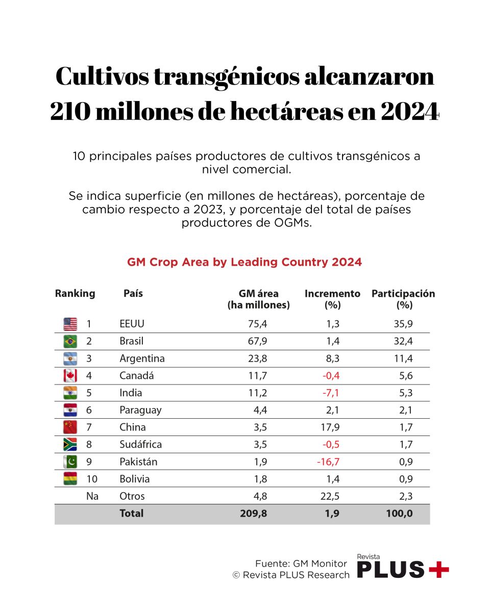 Según el informe anual de la plataforma internacional GM Monitor, la superficie mundial dedicada a cultivos genéticamente modificados (GM o transgénicos) creció un 1,9% en 2024, alcanzando un nuevo máximo histórico de 209,8 millones de hectáreas.