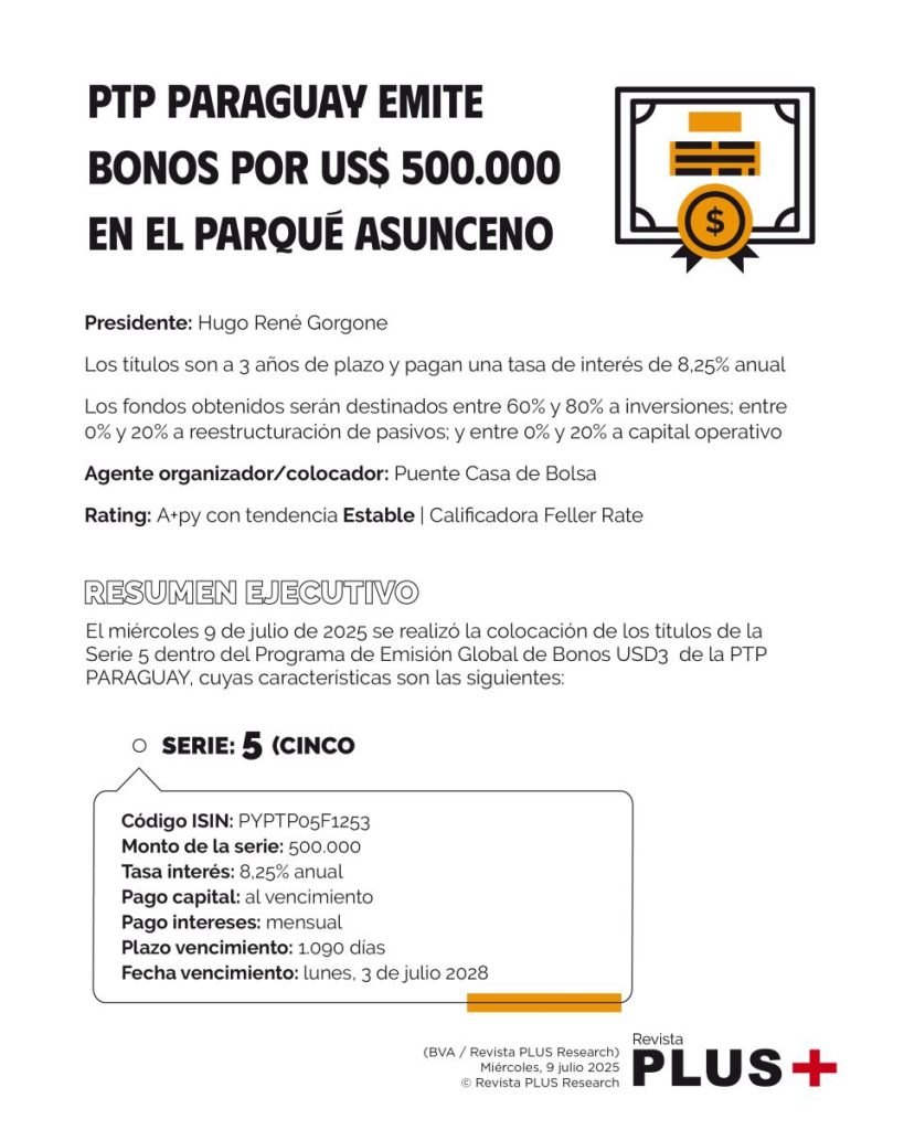 El miércoles 9 de julio de 2025 se realizó la colocación de los títulos de la Serie 5 dentro del Programa de Emisión Global de Bonos USD3 de la PTP PARAGUAY, cuyas características son las siguientes: