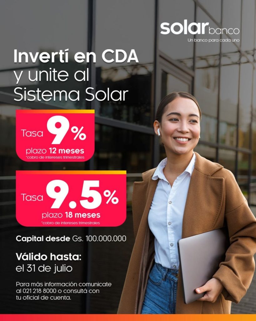 Durante el mes de julio, Solar Banco ofrece condiciones preferenciales en sus Certificados de Depósito de Ahorro (CDA), orientadas a clientes que buscan solidez y rentabilidad para su capital.