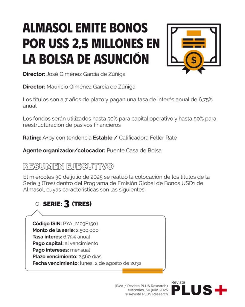 El miércoles 30 de julio de 2025 se realizó la colocación de los títulos de la Serie 3 (Tres) dentro del Programa de Emisión Global de Bonos USD1 de Almasol, cuyas características son las siguientes: