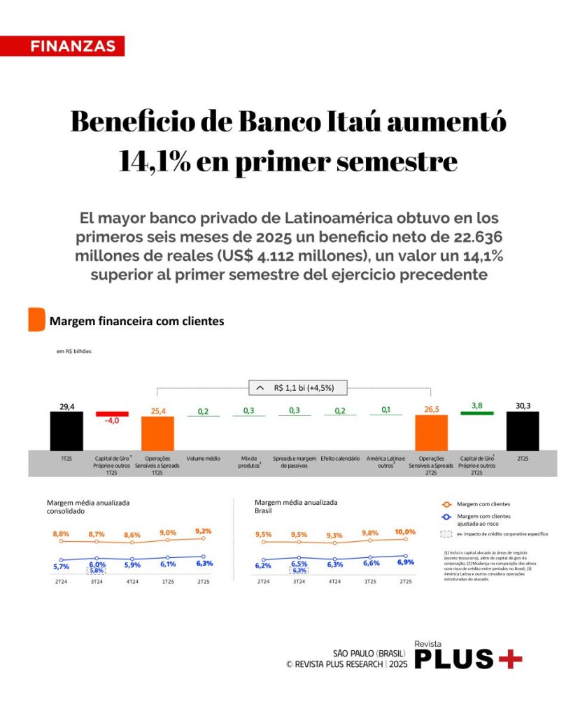 Río de Janeiro, 5 ago (EFE).- El brasileño Itaú, el mayor banco privado de Latinoamérica, obtuvo en el primer semestre un beneficio neto de 22.636 millones de reales (unos 4.112,2 millones de dólares), un valor un 14,1 % superior al de los primeros seis meses de 2024, informó este martes la entidad.