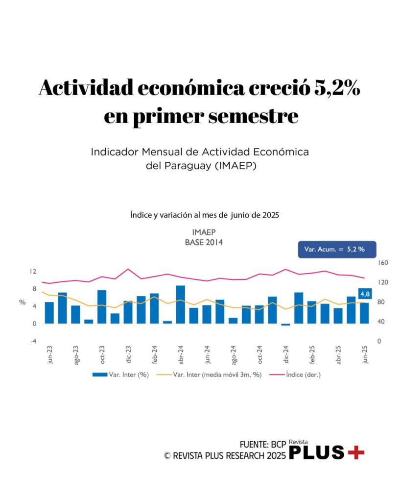 La actividad económica creció 4,8% en junio, comparado con el mismo mes del año anterior, y acumula al cierre del primer semestre un incremento del 5,2%, de acuerdo con el Índice Mensual de Actividad Económica del Paraguay (Imaep) del Banco Central del Paraguay (BCP). Esta dinámica es impulsada por los servicios, manufacturas, generación de energía y la ganadería.