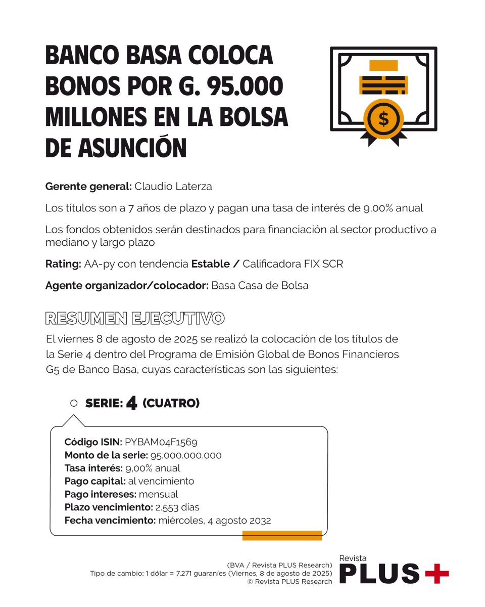 El viernes 8 de agosto de 2025 se realizó la colocación de los títulos de la Serie 4 dentro del Programa de Emisión Global de Bonos Financieros G5 de Banco Basa, cuyas características son las siguientes:
