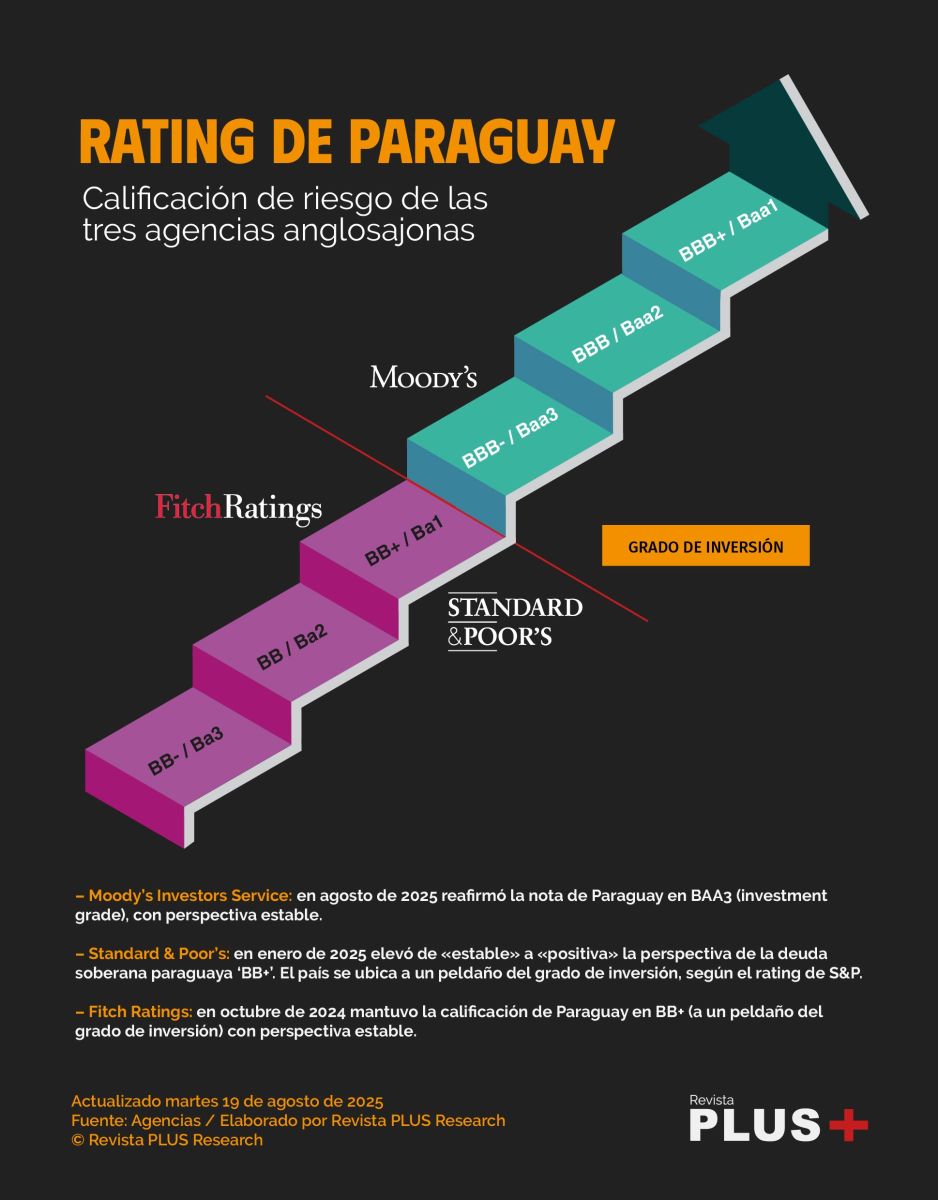 – Moody’s Investors Service: en agosto de 2025 reafirmó la nota de Paraguay en BAA3 (investment grade), con perspectiva estable.