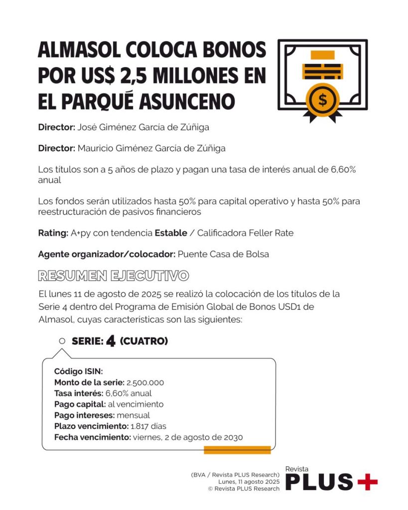 El lunes 11 de agosto de 2025 se realizó la colocación de los títulos de la Serie 4 dentro del Programa de Emisión Global de Bonos USD1 de Almasol, cuyas características son las siguientes: