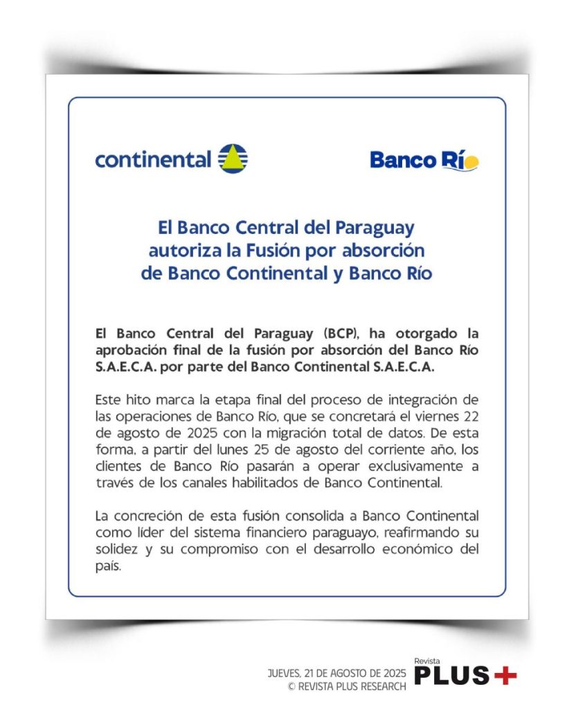 El Banco Central del Paraguay (BCP) otorgó la aprobación final para la fusión por absorción del Banco Río SAECA por parte del Banco Continental SAECA, marcando un hito relevante en el sistema financiero nacional.