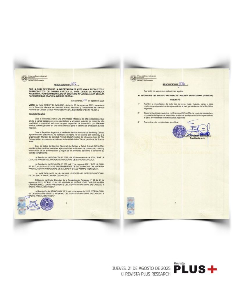 - Prohibición temporal de la importación de aves vivas, productos y subproductos, y alimentos para mascotas de origen avícola procedentes de la República Argentina (Resolución Senacsa N° 1236/2025).