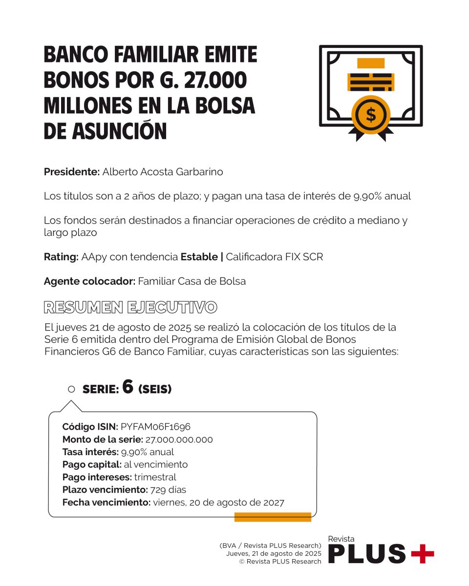El jueves 21 de agosto de 2025 se realizó la colocación de los títulos de la Serie 6 emitida dentro del Programa de Emisión Global de Bonos Financieros G6 de Banco Familiar, cuyas características son las siguientes: