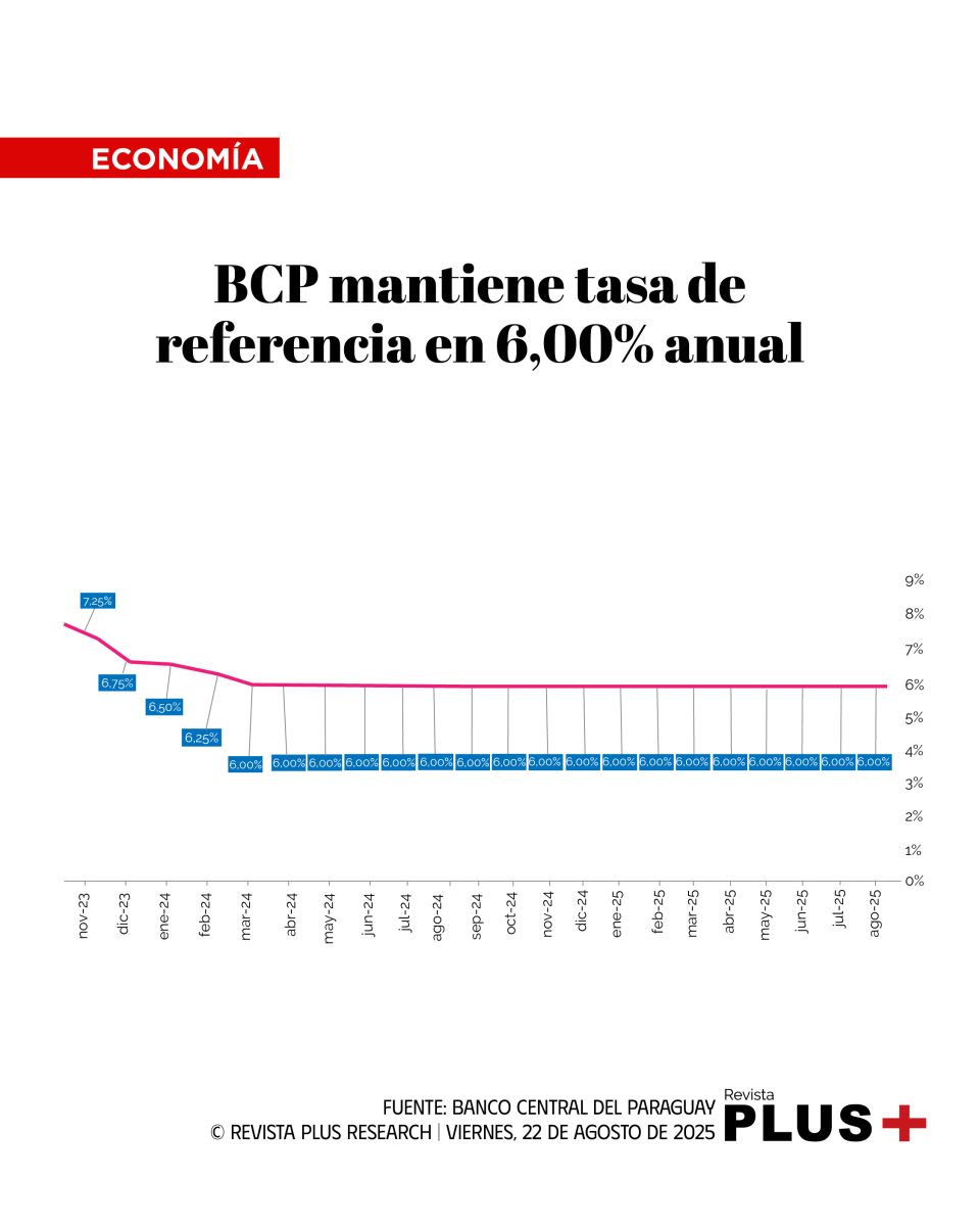 El Banco Central del Paraguay (BCP) decidió, por unanimidad, mantener su tasa de política monetaria (TPM) en 6,00% anual, basándose en la evolución favorable de indicadores de actividad económica y de demanda durante el primer semestre y una inflación en línea con la meta de horizonte de política monetaria.