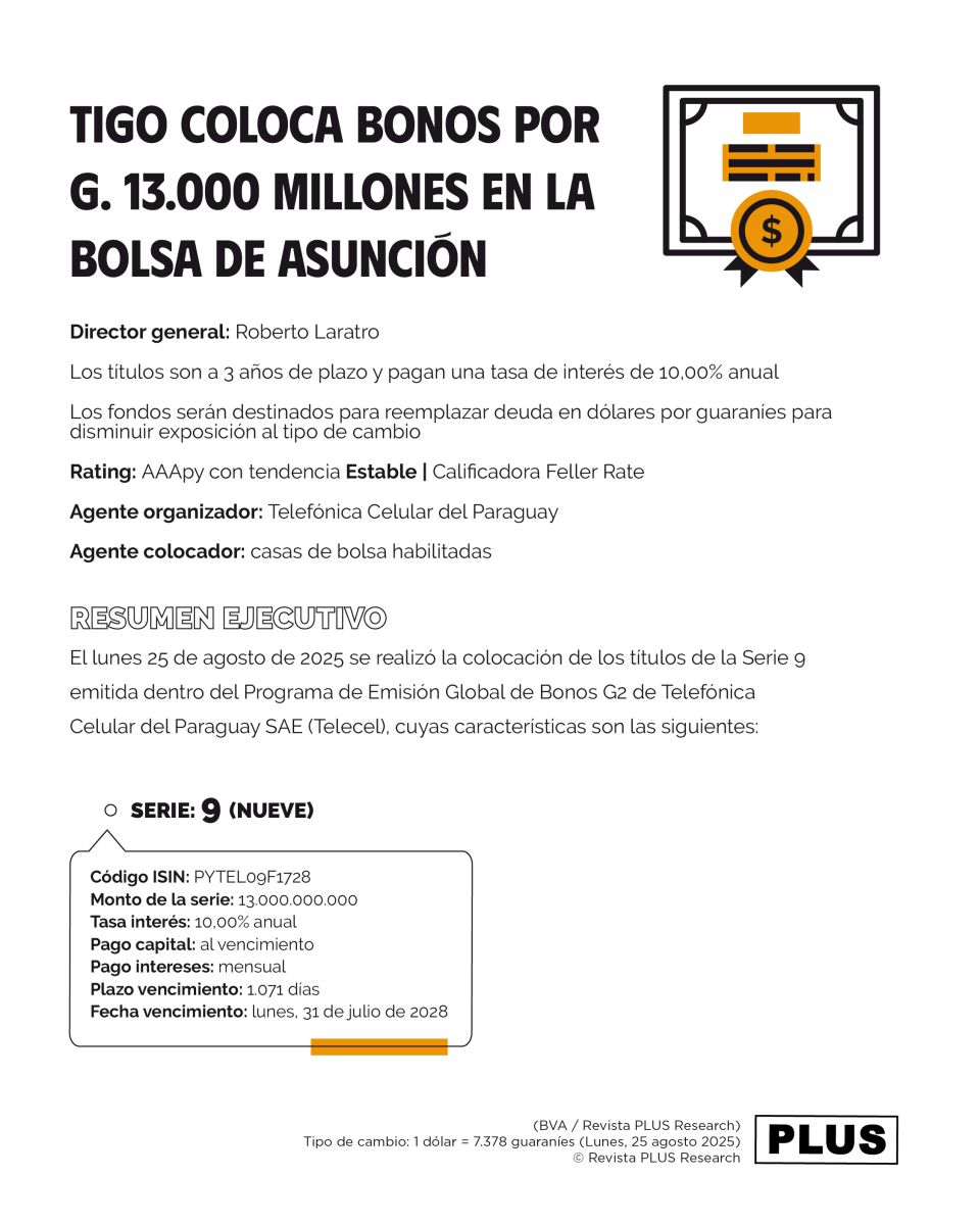El lunes 25 de agosto de 2025 se realizó la colocación de los títulos de la Serie 9 emitida dentro del Programa de Emisión Global de Bonos G2 de Telefónica Celular del Paraguay SAE (Telecel), cuyas características son las siguientes: