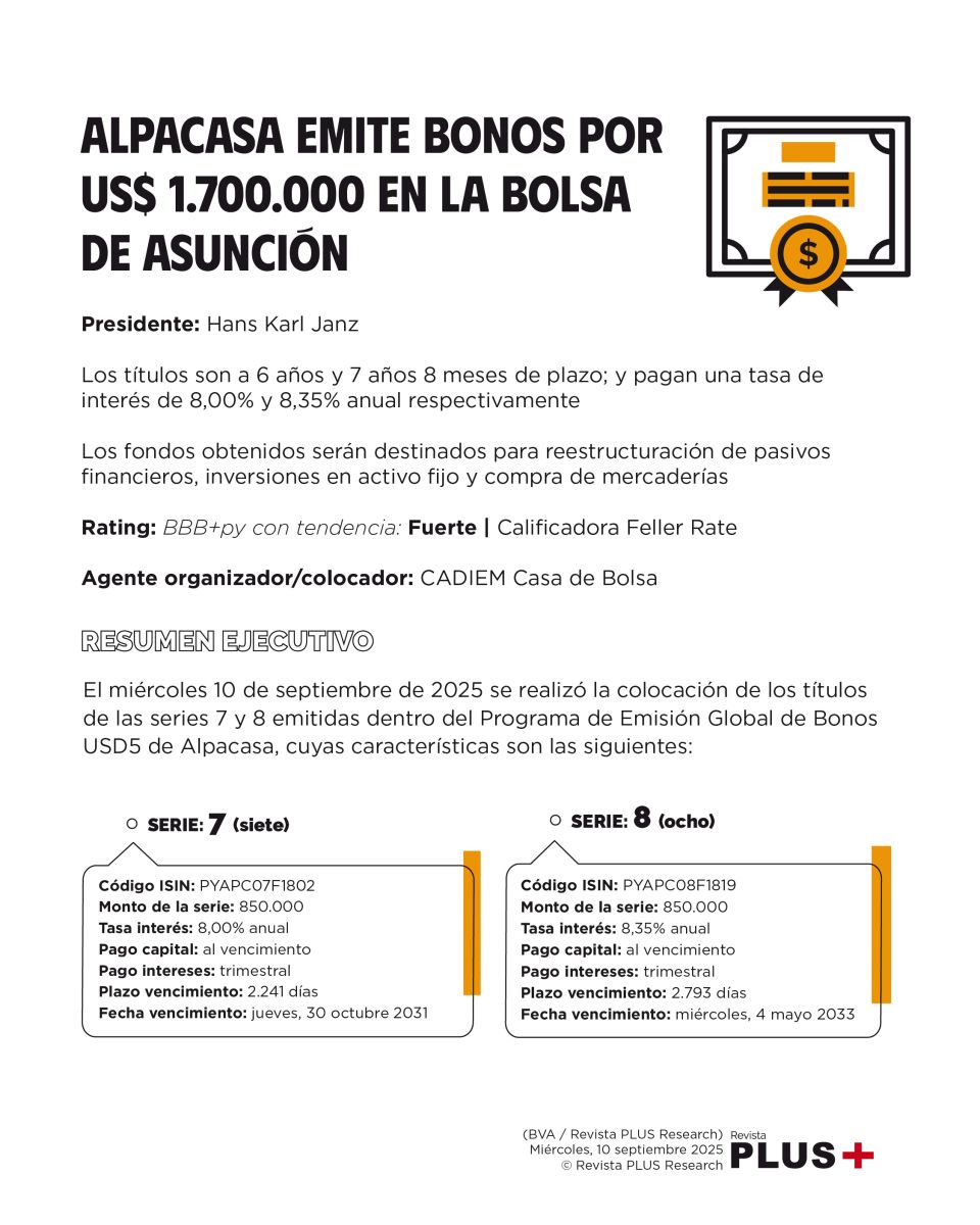 El miércoles 10 de septiembre de 2025 se realizó la colocación de los títulos de las series 7 y 8 emitidas dentro del Programa de Emisión Global de Bonos USD5 de Alpacasa, cuyas características son las siguientes: