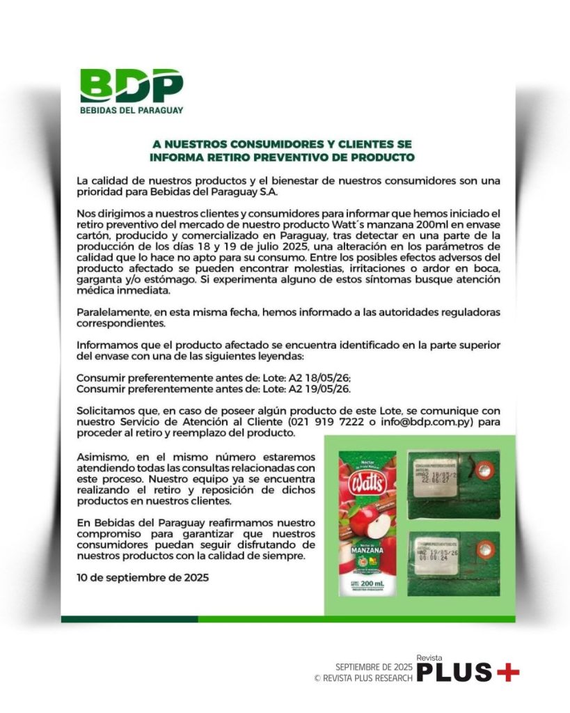 Bebidas del Paraguay SA (BDP) anunció el retiro preventivo de su producto Watt’s Manzana 200 ml en envase de cartón, luego de detectar alteraciones en los parámetros de calidad en parte de la producción correspondiente a los días 18 y 19 de julio de 2025.