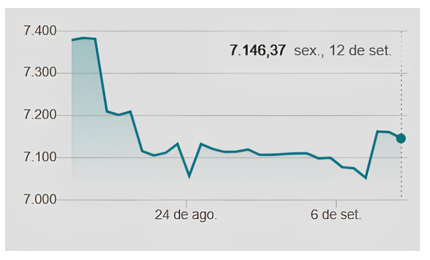Una línea descendente abrupta, seguida de volatilidad el 18 de agosto, cuando el tipo de cambio osciló a ~7.408 guaraníes, refleja las intervenciones del Banco Central del Paraguay (BCP).