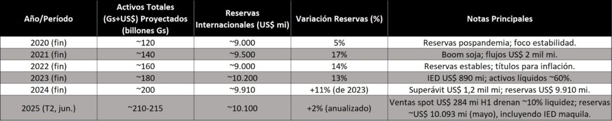 Según los informes anuales y estadísticas monetarias del propio banco central, los activos crecieron consistentemente de 2020 a 2025, impulsados por flujos de exportaciones y acumulación de reservas internacionales, con ajustes tácticos vía ventas de títulos y dólares que drenaron liquidez operacional.