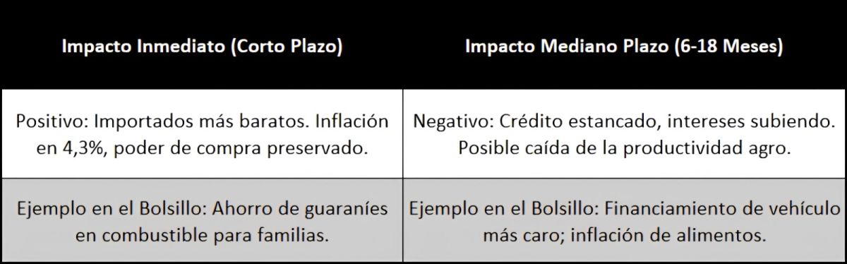 • Insumos agrícolas y alimentos con mitigación mixta: fertilizantes y pesticidas cruciales para el agro (12% del PIB) vieron costos importados atenuados por la fuerza del guaraní, sin traslados inflacionarios marcados hasta ahora.