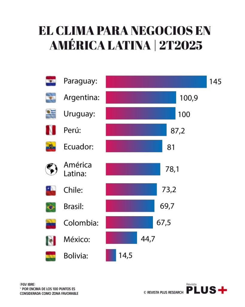 Conforme a los datos de la última encuesta hecha por la Fundación Getulio Vargas (FGV), Paraguay es el país mejor posicionado en el Índice de Clima Económico (ICE) con 145 puntos al segundo trimestre de 2025; esto representa un incremento 9,6 puntos en comparación al mismo periodo del año anterior cuando la puntuación era de 135,4.