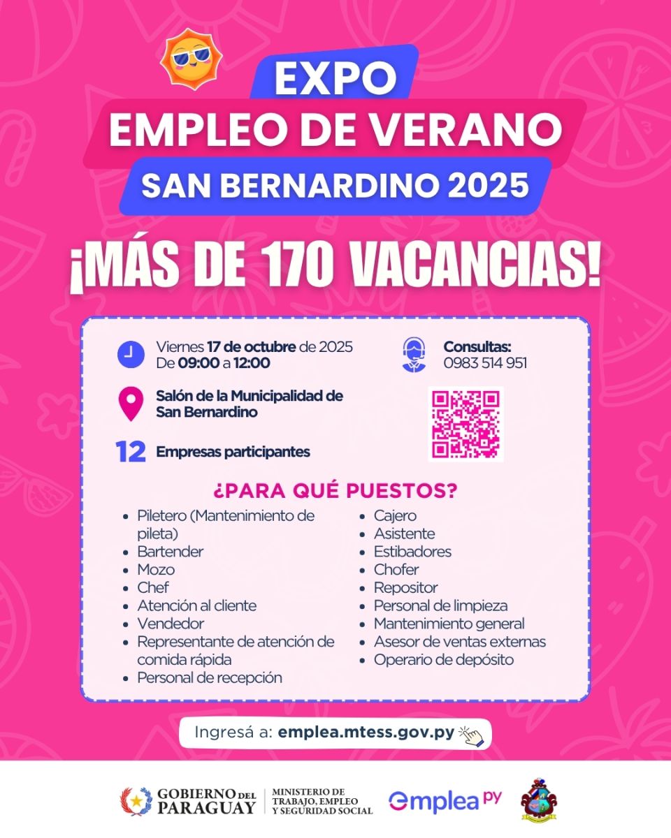 El Ministerio de Trabajo pondrá en marcha este viernes 17 de octubre el Plan de Empleo de Verano, con la realización de la Expo Empleo de Verano San Bernardino 2025, una jornada que ofrecerá 179 oportunidades laborales en una docena de empresas de distintos rubros.