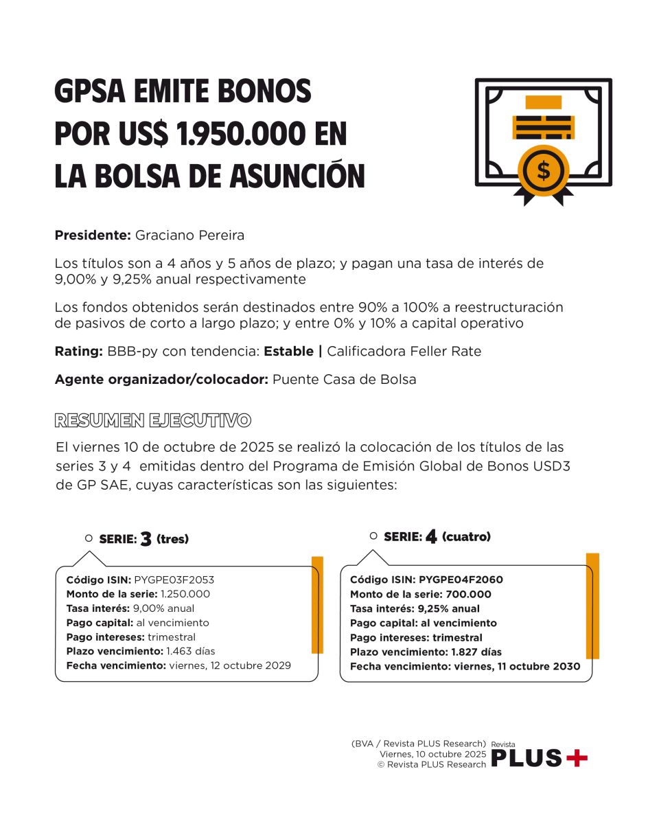El viernes 10 de octubre de 2025 se realizó la colocación de los títulos de las series 3 y 4 emitidas dentro del Programa de Emisión Global de Bonos USD3 de GP SAE, cuyas características son las siguientes: