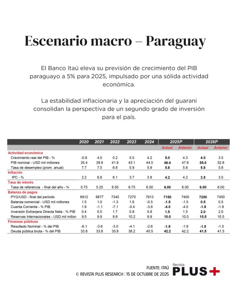 El impulso económico de Paraguay se consolida y proyecta un 2025 con mayor crecimiento y estabilidad. El Banco Itaú elevó su previsión del PIB paraguayo a 5,0%, destacando la fortaleza de los servicios y la confianza en la economía nacional.
