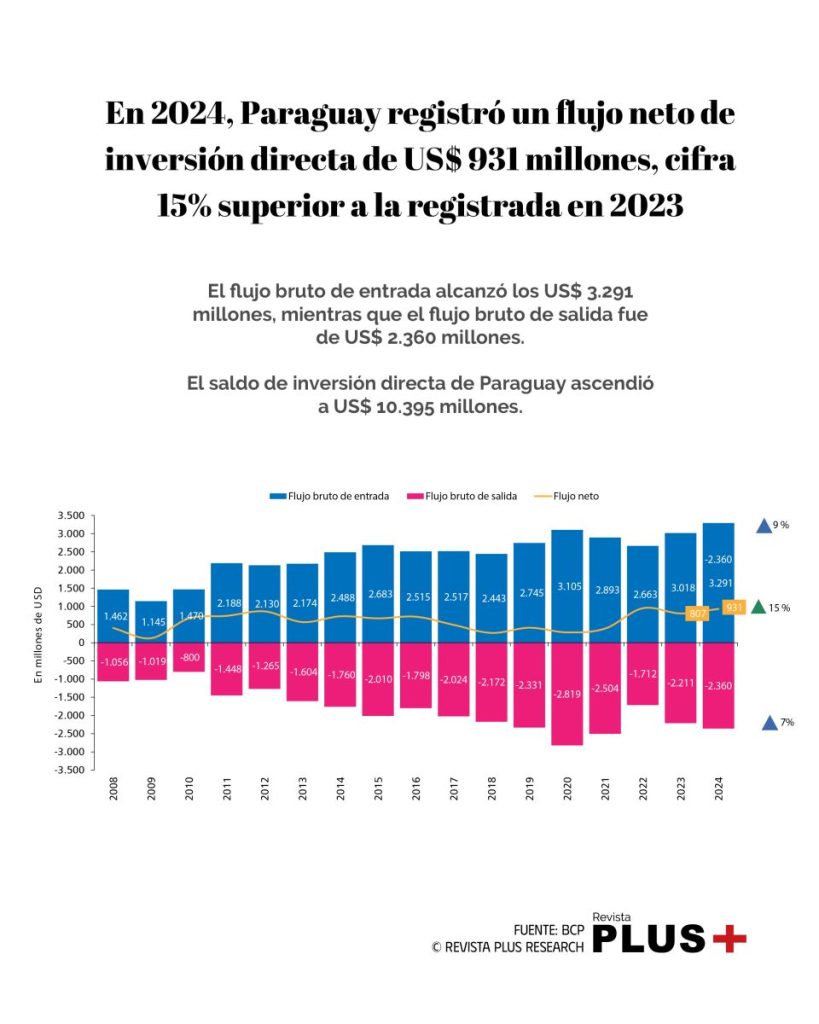Asunción (Paraguay).- El flujo neto de Inversión Directa alcanzó los US$ 931 millones en 2024, reflejando un aumento de 15% con respecto a la cifra registrada el año anterior, según un informe del Banco Central del Paraguay.