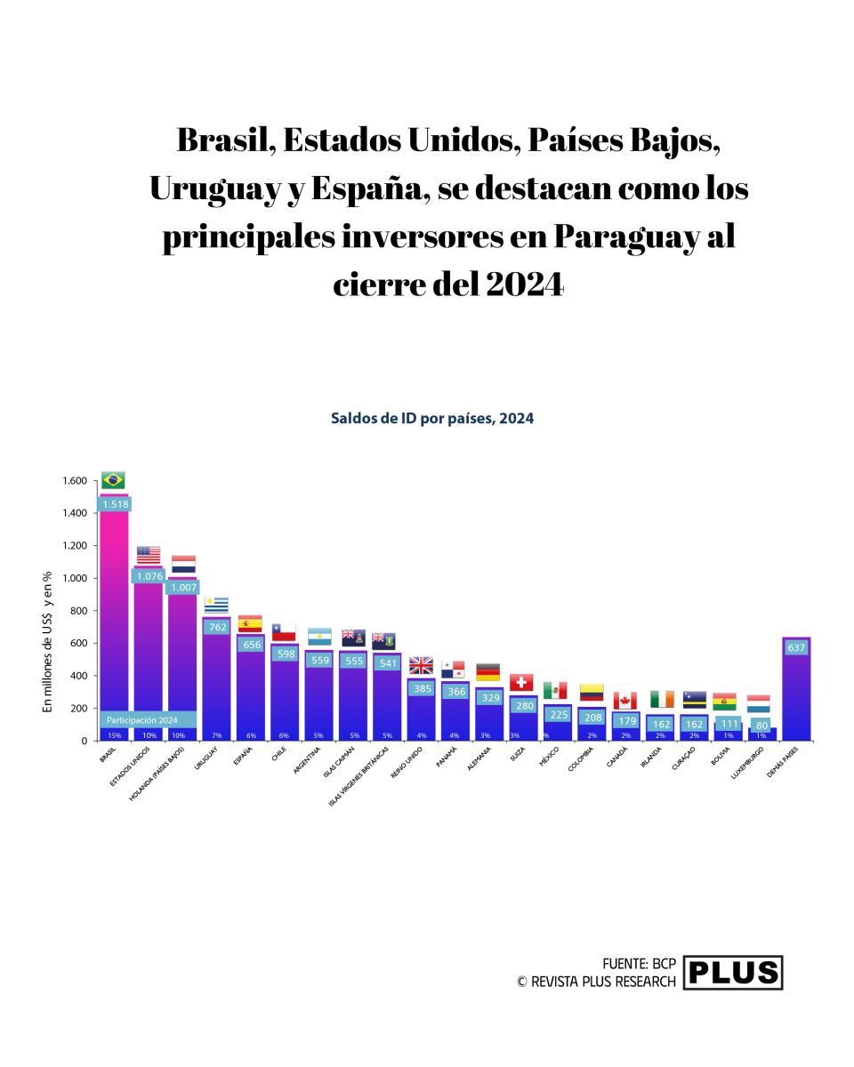 Actualmente, los principales inversionistas provienen de Brasil, Estados Unidos, Países Bajos, Uruguay y España; mientras que Chile, Argentina, Islas Caimán e Islas Vírgenes Británicas ampliaron su participación. El número de países inversionistas directos en el país ascendió a 68 en 2024.