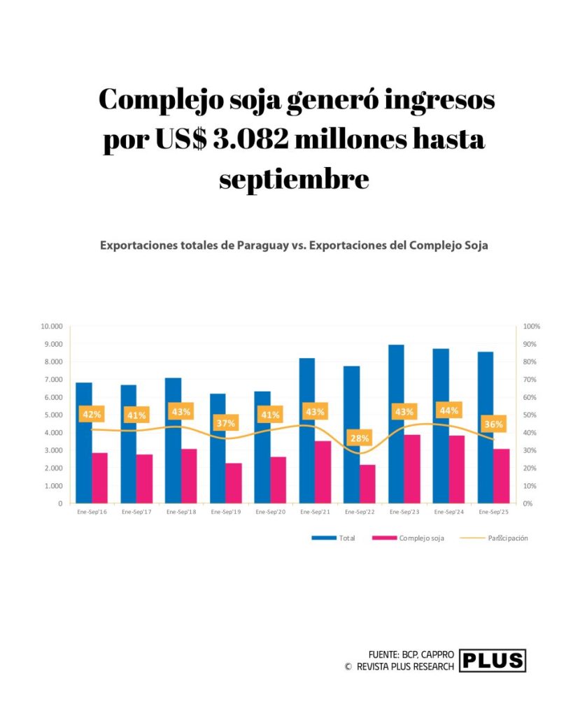 Aunque enfrenta un escenario internacional desafiante, el complejo soja, que incluye granos, aceite, harina y cascarilla, continúa siendo el principal motor exportador del Paraguay, generando US$ 3.082,6 millones al cierre del mes de septiembre de 2025. Este monto representa el 36% de todas las ventas externas del país, reafirmando la centralidad del sector en la estructura económica nacional.