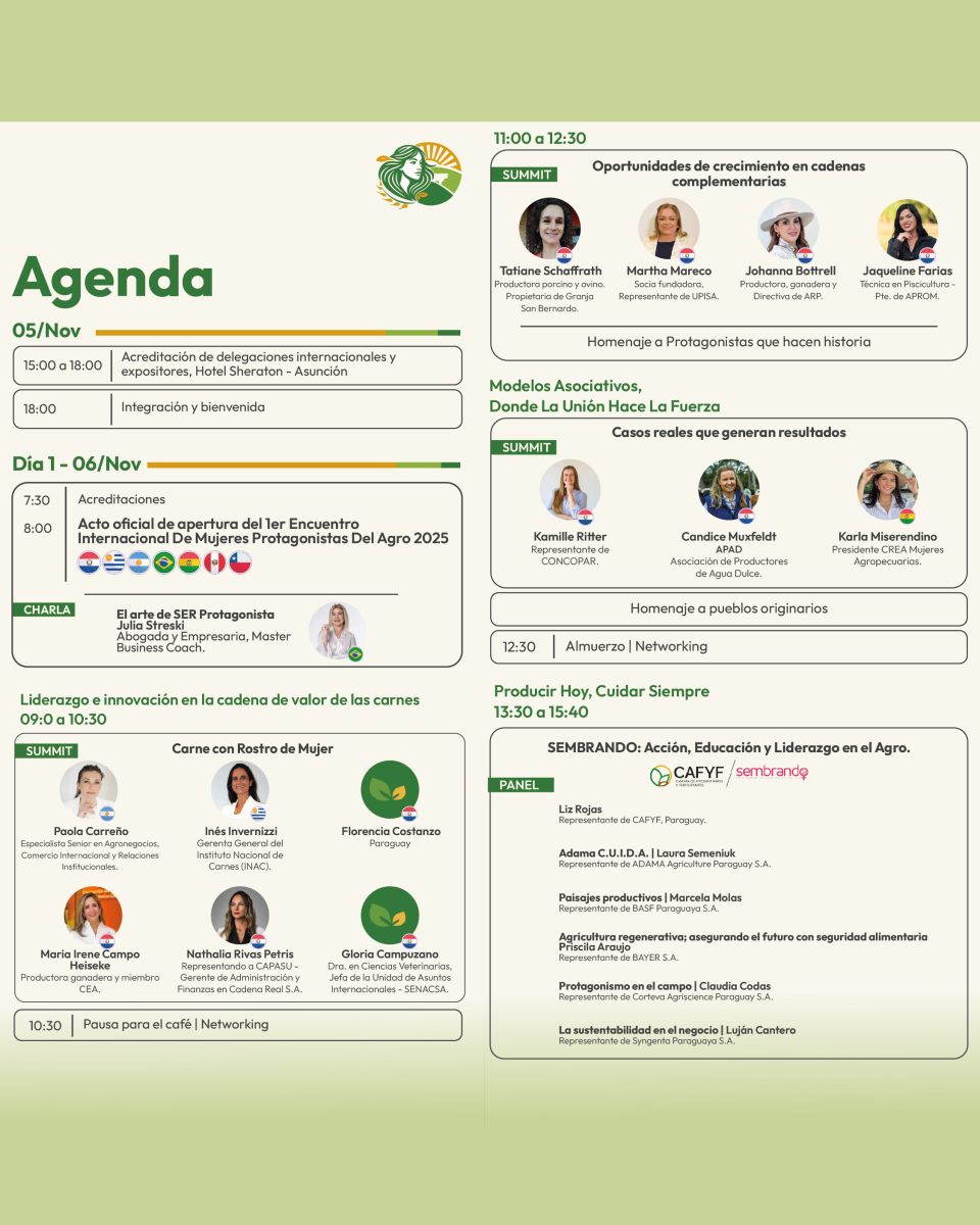 El “Primer Encuentro Internacional de Mujeres Protagonistas del Agro 2025”, impulsado por la iniciativa Mujeres Protagonistas del Agro, se desarrollará los días 6 y 7 de noviembre en el Hotel Sheraton Asunción, con la participación de productoras, empresarias, investigadoras, técnicas y líderes del sector provenientes de Uruguay, Argentina, Chile, Perú, Brasil, Bolivia y Paraguay.