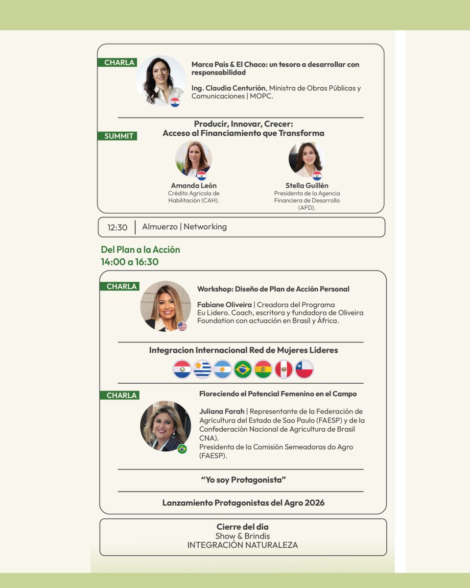El evento incluirá también espacios de promoción al emprendedurismo, formación en liderazgo personal y un brindis de cierre con el lanzamiento oficial de “Protagonistas del Agro 2026”, como símbolo de continuidad y cooperación regional.