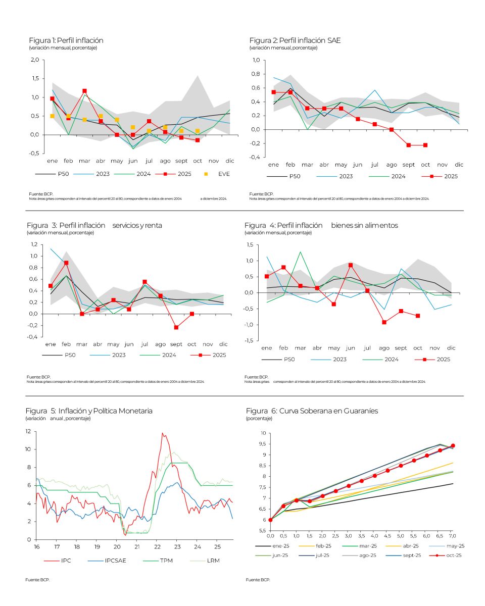 El informe económico de BASA Capital, elaborado por el economista Wildo González, destaca que la inflación de octubre registró una nueva sorpresa negativa. El rápido descenso de la inflación subyacente (SAE) sugiere un traspaso cambiario más intenso de lo habitual, lo que podría llevar al Banco Central del Paraguay a considerar una reducción de su Tasa de Política Monetaria (TPM) en los próximos meses.