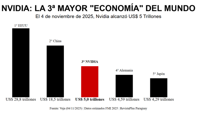 El 4 de noviembre de 2025, Nvidia se convirtió en la primera empresa en valer US$ 5 trillones, más que el PIB de Alemania (US$ 4,59 trillones) y Japón (US$ 4,29 trillones) juntos. Mostrando un posible desacople entre valor de mercado y economía real.