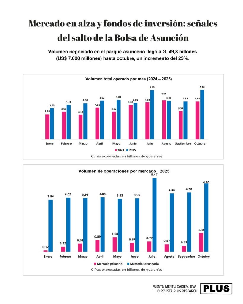 Entre enero y octubre, el mercado secundario acumuló G. 42,8 billones, con una expansión interanual del 36%, mientras que el primario alcanzó G. 6,93 billones, duplicando prácticamente los niveles del 2024.