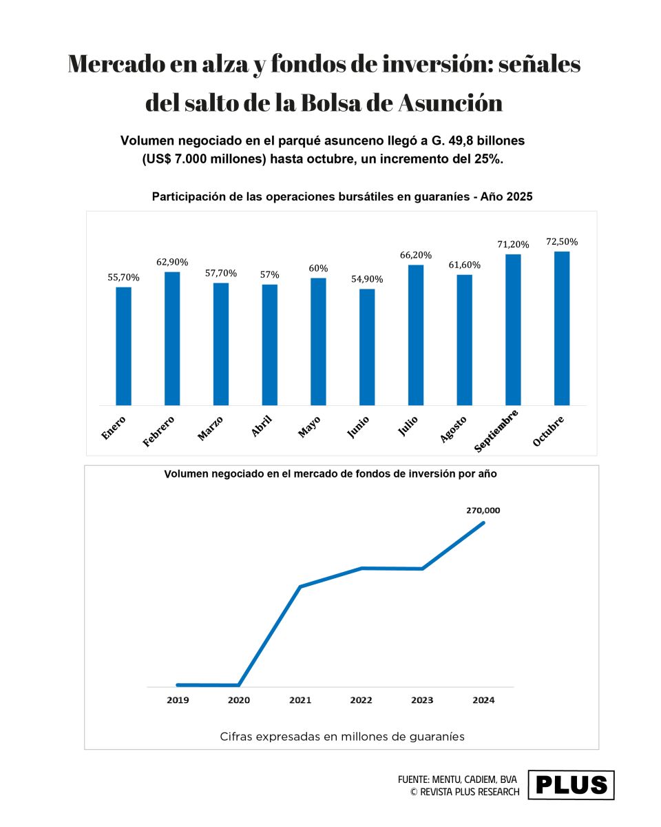 La Bolsa de Valores de Asunción (BVA) cerró octubre con un volumen acumulado de G. 49,8 billones (unos US$ 7.000 millones al cambio actual), lo que representa un crecimiento del 25% respecto a los G. 39,7 billones negociados en el mismo periodo de 2024.