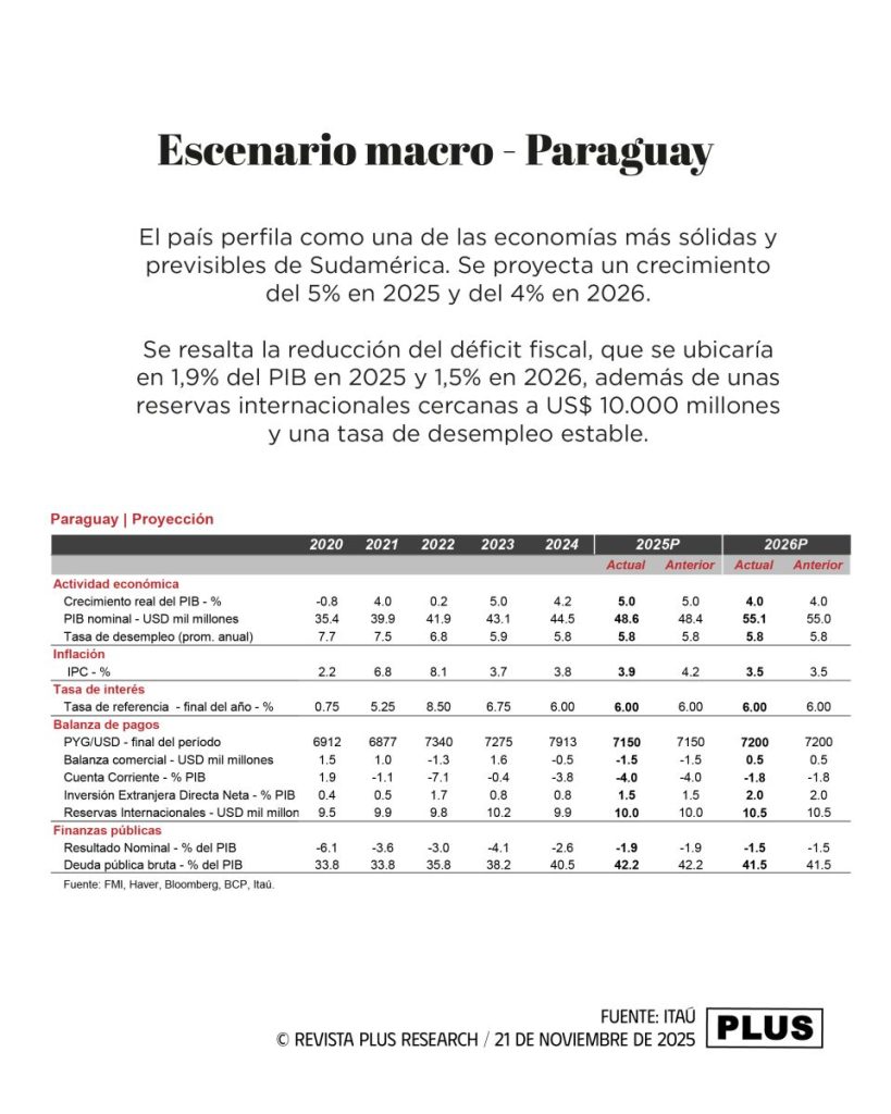 El informe de Itaú concluye que la combinación de crecimiento sostenido, baja inflación y prudencia fiscal deja a Paraguay en una posición de fortaleza para 2026, con riesgos al alza para el crecimiento y un clima propicio para nuevas inversiones en infraestructura, energía y agroindustria.